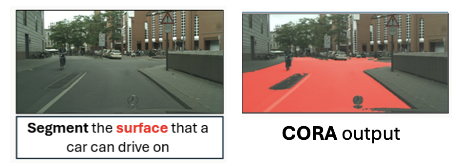 CORA is a semi-supervised reasoning segmentation framework that jointly learns from limited labeled data and a large corpus of unlabeled images. |