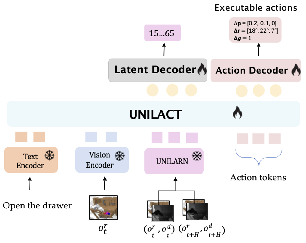 UniLACT is a Vision-Language-Action model that incorporates geometric structure through depth-aware latent pretraining, enabling downstream robot policies to inherit stronger spatial priors. |